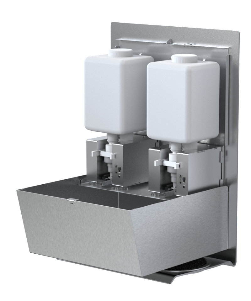 Flüssigkeitsspender aus Edelstahl für den Einsatz von Flüssigseife, Schaumseife, Lotion und Desinfektionsmittel. Die Modellvariante „Tischspender Duo“ eignet sich zum Aufstellen auf ebenen Flächen. Ein Kippschutz verhindert umfallen bei leichten Stößen. Die eingebauten Dosiereinheiten werden mit 6 x 1,5V AA-Batterien (im Lieferumfang enthalten) betrieben. Die Betätigung erfolgt berührungslos über integrierte Infrarotsensoren. Pro Betätigung wird ca. 1 ml ausgegeben. Der Flüssigkeitsspender eignet sich für drei verschiedene Flüssigkeiten. Die Entwicklung und Herstellung der Bauteile, auch elektronischer Komponenten und Software, erfolgt in Deutschland (Made in Sternenfels).